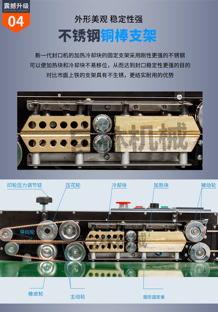 FR-900W全自动封口机,可以输送台加宽至400mm,承重加至10kg适用大米袋等较大较重产品封口。